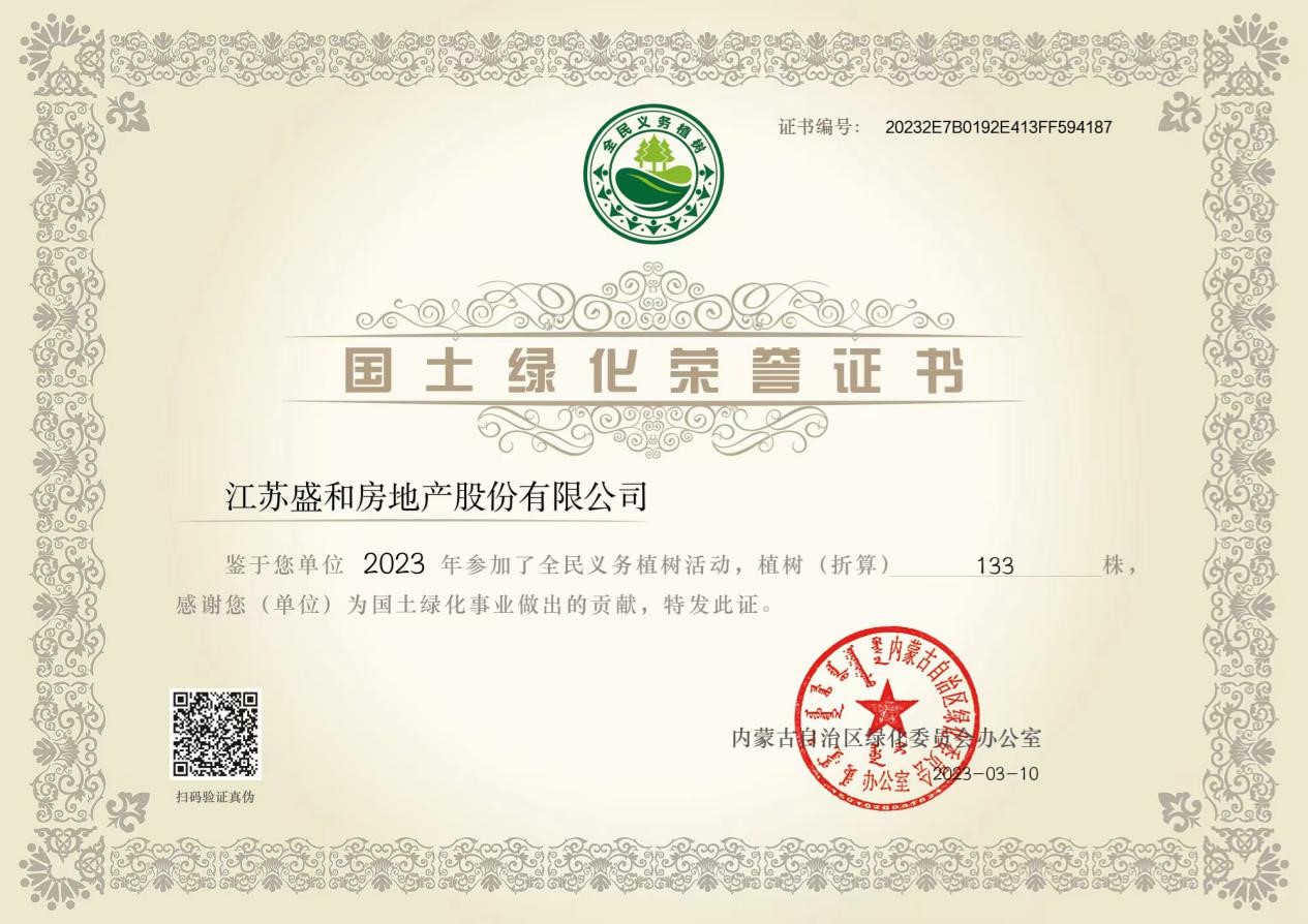 植樹造林,綠化祖國,是我國的一項基本國策。今年,盛和房產(chǎn)參與全民義務(wù)植樹“獻一份愛心 護沿黃生態(tài)”項目,協(xié)助推進黃河流域生態(tài)保護和高質(zhì)量發(fā)展。公司此次共捐資植樹133株,獲得內(nèi)蒙古自治區(qū)綠化委員會辦公室頒發(fā)的國土綠化榮譽證書。