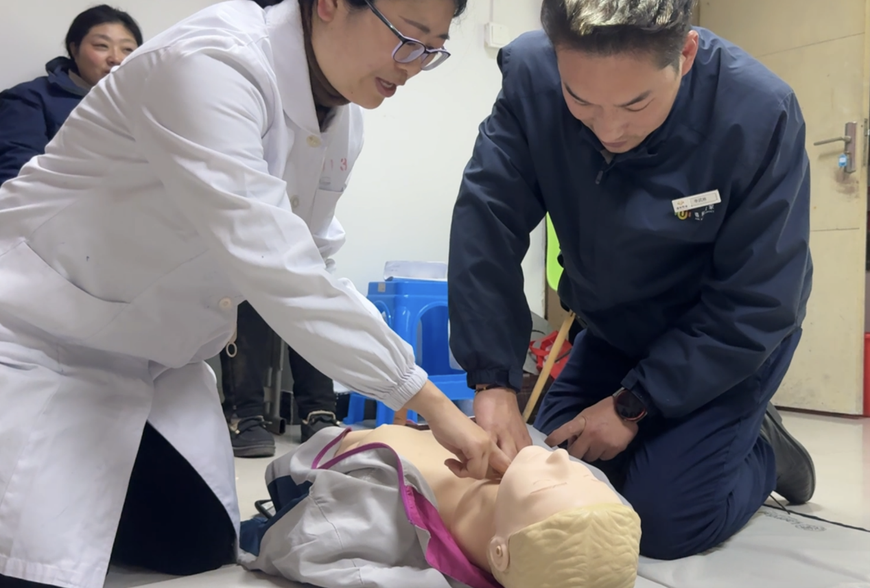 培訓過程中,南通三院心內科顧建國主任帶來了干貨滿滿的理論講解。盛和悅家的物業人員們全神貫注,認真聆聽顧主任關于現場急救種類及基礎知識的細致闡述,逐漸明晰在面對各類突發狀況時應如何迅速且準確地做出判斷與反應。緊接著,心內科崔紅艷護士長進行心肺復蘇(CPR)實操演示,其專業嫻熟的動作令在場人員印象深刻。盛和悅家的物業人員們踴躍上手實踐,在崔護士長及顧主任的耐心指導下,逐漸掌握了正確的操作要領,每一次按壓、每一次人工呼吸都力求標準規范,不斷糾正與完善自身技能。